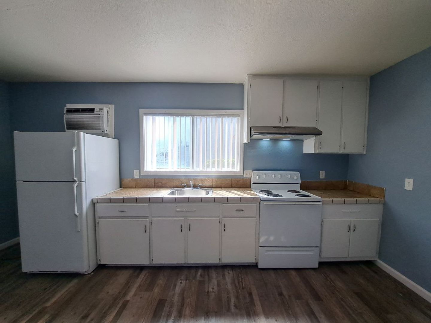 The kitchen includes a refrigerator and electric stove, making meal preparation simple and efficient. Ceiling fans, along with a wall air conditioner and heater, help maintain a comfortable indoor environment throughout the year.